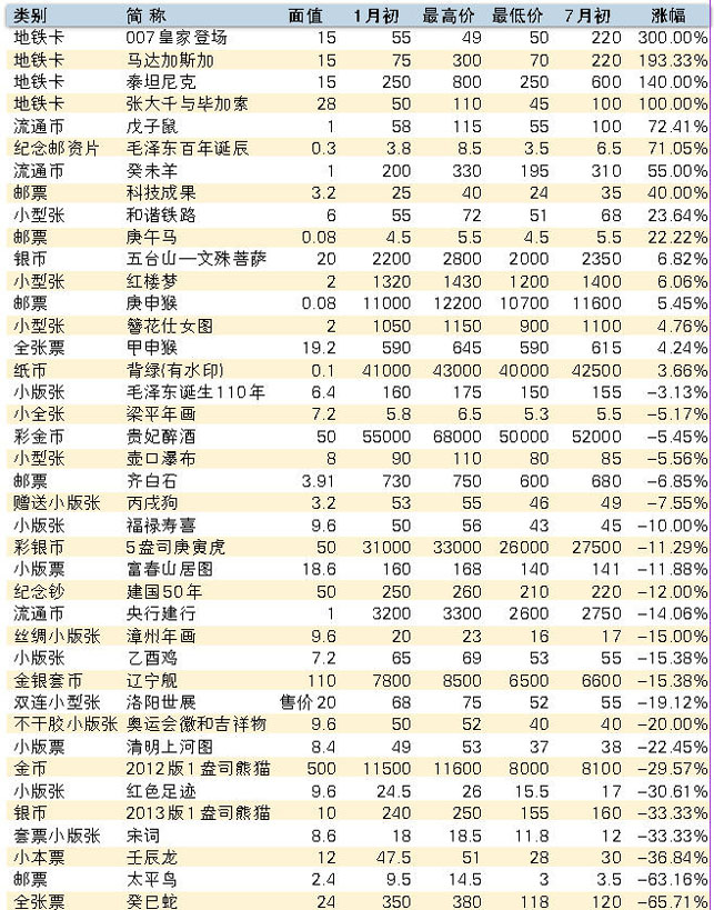 藏市上的大板块在上半年都出现了回调乃至走弱的现象,但其中的小版块依然有活跃表现,除了币市中的流通币板块走势稳定外,磁卡板块中的“地铁卡”则出现了骄人的表现,也是整个藏市中唯一逆势走强的板块。