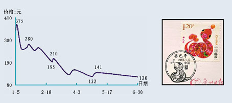 新邮表现颓萎并非孤立,前期热点新邮的回调之势同样在加大。如近8年来具有标志性意义的“北京奥运会徽和吉祥物”不干胶品种在6月初被击破50元颈线位后,6月末则下跌到40元的生命线,此线一破则预示此前8年介入的投资者将悉数被套。而2010年牛市中披荆斩棘的“行书”小版张也下滑至60元,同样在考验多空颈线位。此外,具有浓重“庄邮”色彩的“甲申猴”全张票再次退回到600元附近,该张离580元的支撑位也仅一步之遥,至于“洛阳世展”双连小型张则下滑到55元,歇夏期内极可能会考验50元的牛熊分界位。