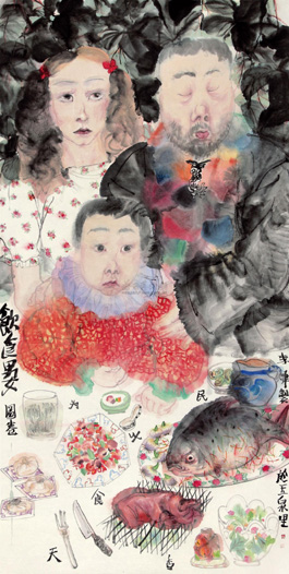 同文人墨客的清高相比,李津作品传达的是世俗的情调。画面中的人物,随性勾勒,或恬淡,或呆滞,或惊悚。这些作品用色鲜明夺目,凸显出画中的美味艳情。