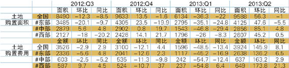 表2 2012年Q3 -2013年Q2土地购置面积及费用情况 单位:万平方米,亿元