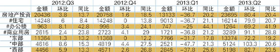 表3 2012年Q3 -2013年Q2房地产开发投资及增长情况 单位:万平方米、亿元,%