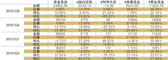 表6 2012年Q3 -2013年Q2开发企业资金来源情况 单位:亿元
