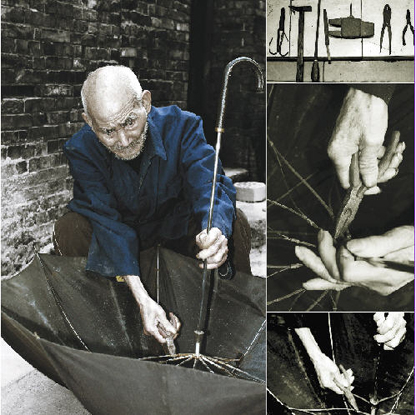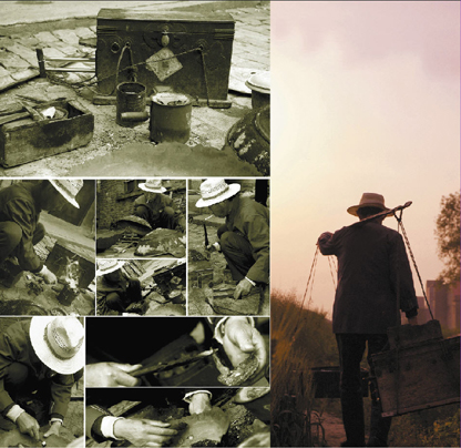 老人的讲述勾起了龚为的心思:为什么不把他记录下来呢?等真的消失了,恐怕就再也来不及了。他为自己的想法兴奋。可真到拍摄的时候,龚为又是费了一番周折。好说歹说,又请朋友帮忙游说,老人家才算答应。拍了两天,老人不干了,老伴儿旁边说着风凉话:功夫都被占了,出去做生意还能有50块的收入。听话听音儿,龚为忙掏出50块钱塞在老人手里,才算搞定。反反复复,前后花了一个月的时间,拍了500多张样片,龚为终于完成了第一组老行当照片,那张锔碗匠的照片,老人挑着担子的背影,镶嵌在夕阳的余辉里,光影的变幻中,有股没落、苍凉的意味。