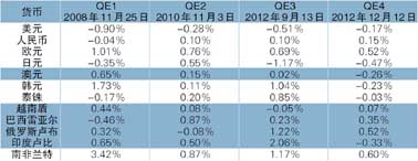新兴市场货币涨跌互现。新兴市场货币在国际资本流动和本国汇率政策的博弈中涨跌互现。人民币在有管理的浮动汇率制度下,整体维持强势,QE1到QE4公布之间,人民币累计升值约9.57%。在此期间,韩元累计升值1.16%,泰铢累计升值14.93%,巴西雷亚尔累计升值12.36%,南非兰特累计升值12.74%。另外,部分货币呈贬值态势,如越南盾累计贬值18.91%,俄罗斯卢布累计贬值10.81%,印度卢比累计贬值8.73%。(表1)