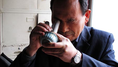 朱文立正在为记者演示鉴别汝瓷的方法——用专业放大镜观看汝瓷片上“廖若星辰”的气泡。