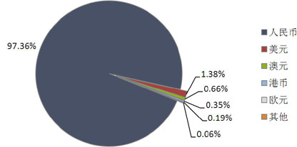 从投资币种来看,人民币理财产品的发行量依旧占据绝对优势地位,该币种产品的发行数量为3095款,较上月增加6款,市场占比下降0.40个百分点至97.36%。外币理财产品方面,美元理财产品发行了44款,较上月增加1款,市场占比上升0.02个百分点至1.38%;澳元理财产品发行了21款,较上月增加8款,市场占比上升0.25个百分点至0.66%;港币理财产品发行了11款,较上月增加1款,市场占比上升0.03个百分点至0.35%;欧元理财产品发行了6款,较上月增加1款,市场占比上升0.03个百分点至0.19%;此外还有2款英镑产品发行。(图2)