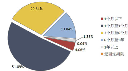 从投资期限来看,1个月(含)以下期产品发行了129款,较上月增加20款,市场占比上升0.61个百分点至4.06%;1个月至3个月(含)期产品发行了1624款,较上月减少71款,市场占比下降2.55个百分点至51.09%;3个月至6个月(含)期产品发行了939款,较上月增加30款,市场占比上升0.77个百分点至29.54%,6个月至1年(含)期产品发行了440款,较上月增加58款,市场占比上升1.75个百分点至13.84%;1年以上期产品发行了44款,较上月减少13款,市场占比下降0.42个百分点至1.38%;无固定期限理财产品发行了3款,较上月减少5款,市场占比下降0.16个百分点至0.09%。(图3)