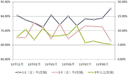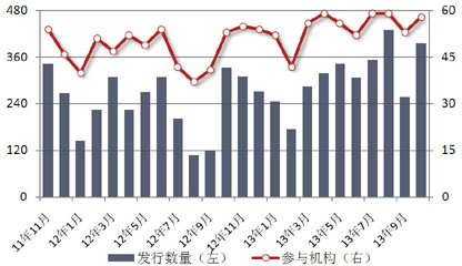 2013年10月,130家银行共发行了3179款个人理财产品,较9月份增加19款。其中,122家中资银行发行了3087款,8家外资银行发行了92款。中资银行中,6家国有银行发行了841款,与9月份相比减少39款,市场占比下降1.39个百分点至26.45%;12家股份制商业银行发行了909款,与9月份相比减少31款,市场占比下降1.15个百分点至28.59%;72家城市商业银行发行了1129款,与9月份相比增加30款,市场占比上升0.74个百分点至35.51%;32家农村金融机构发行了208款,与9月份相比增加24款,市场占比上升0.72个百分点至6.54%;8家外资银行发行了92款,与9月份相比增加35款,市场占比上升1.09个百分点至2.89%。