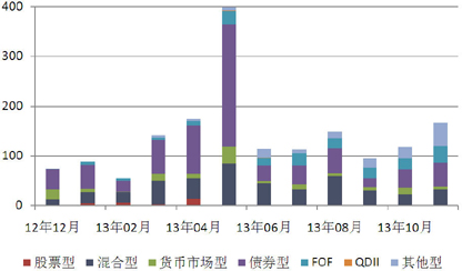 本月,42家证券公司或其资管公司共发行了券商集合理财产品167款,增幅41.53%,平均首发目标规模14.31亿元,增幅19.95%,其中:债券型产品发行了48款,增幅33.33%,平均首发目标规模22.58亿元,增幅8.28%;货币市场型产品发行了5款,降幅64.29%,平均首发目标规模20.00亿元,增幅115.26%;混合型产品发行了32款,增幅52.38%,平均首发目标规模17.60亿元,增幅156.12%;股票型产品发行了1款,平均首发目标规模50.00亿元,增幅400.00%;FOF产品发行了34款,增幅47.83%,平均首发目标规模4.27亿元,增幅13.87%;其他类产品发行了47款,增幅104.35%,平均首发目标规模5.52亿元,降幅57.91%。 券商资产管理计划首发目标规模上升与阳光私募小规模募集形成鲜明对照,证明了券商的募资能力可能有较大提升。(图9)