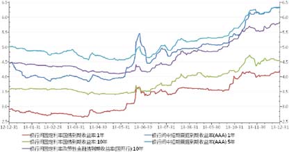 图1 2013年银行间国债、政策性金融债、中短期票据走势