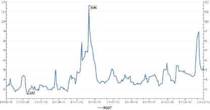 图3 2013年银行间7天质押式回购利率走势