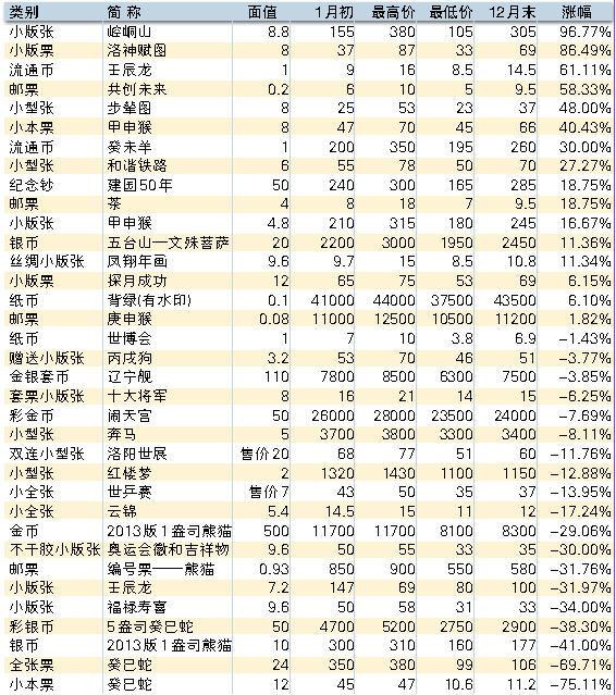 下面再来看看各个热门板块在2013年的具体表现,投资者可以从中更直观地了解到一年来的邮市变化。