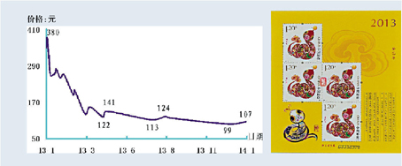 2013年初发行的“癸巳蛇”邮票无疑是新邮高开低走的“杰出”代表,也是对市场吸金最大的一个新邮。让人感到不可思议的是,10月份市场甫入秋季行情,部分新邮再度陷入高开中,但因市场资金匮乏,同样出现跳水表现,如“中国梦”、“习仲勋”和“毛泽东诞生120年”套票面世初期分别高达18元、23元和20元,而2014年1月末市价已分别下挫至8元、4.5元和8.5元,跌幅同样惊人。