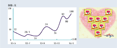小版张的表现就显得相对弱势,这可以从近几年发行的小版张价格整体下滑中窥得。其中2013年发行的小版张中,就有半数跌破面值,如“第十二届人大”、“桃花”、“景泰蓝”和“中国古镇(1)”小版张即分别成为打折张。唯一令人刮目相看的则是“母亲节”小版张,其在1月末创出100元新高。