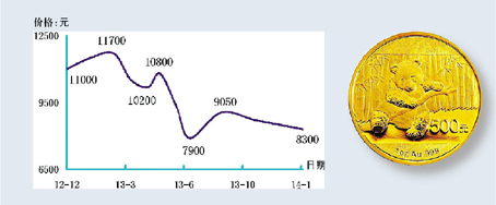 从价格看,跟随金银价格变化的“熊猫”金银币首当其冲,跌幅几乎与国际金银价格划等号,尤其是“熊猫”1盎司金币最为明显。如2013版1盎司“熊猫”金币在2013年初的价格是11700元,而到了2014年1月末市价已下沉到8300元附近,跌幅29%,如果参考2014版“熊猫”1盎司金币价格可能更能说明问题,其2013年11月份亮相的面世价即低悬在8500元左右,目前市价则徘徊在8000元。“熊猫”银币同样遭遇霜打,2013版1盎司“熊猫”银币从去年初的240元下跌至今年1月下旬的178元,跌幅为26%,但去年11月份发行的2014版1盎司“熊猫”银币市价仅为164元,此价应更贴近国际银价。