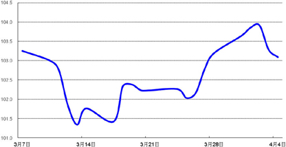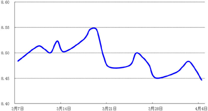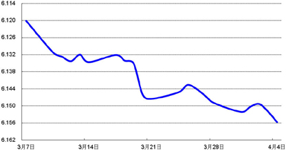 上周,人民币对美元即期市场成交价日内波动出现收窄趋势,周五收盘于6.2123元,与前一周相比变动不大。市场对人民币后市升贬值预期较为分化,投资者静待3月份外贸和外汇占款数据为后期汇率走势提供方向性指引。