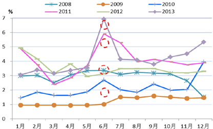 综上所述,资金供给整体增加,而另一方面,随着中国一线城市的楼盘降价促销,房地产市场的降温将使房地产投资增速和购房的资金需求下降。而且由于市场机构普遍吸取去年6月钱荒的教训,对流动性管理今年较为谨慎,这可能将使6月的资金紧张程度低于市场预期。不过,仍需密切关注国际资金流向是否会因人民币持续贬值和美国退出QE加快而逆转,以及季末银行冲存款、地方政府偿债和信托兑付压力带来的资金面阶段性紧张。预计7天回购利率6月中枢将在3.3%-3.8%。