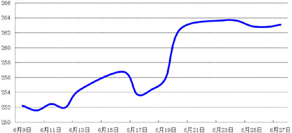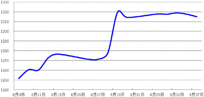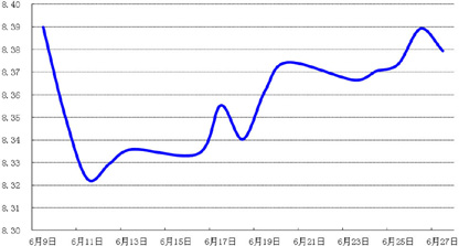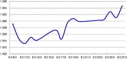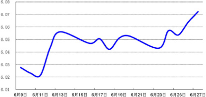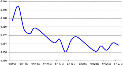 上周,市场预期的年中大额购汇并没有突出表现,市场参与者对短期内人民币走势看法较为分化,人民币对美元即期市场成交价在6.22-6.24元区间持续振荡,周五收于6.2180元,当周累计升值0.13%。