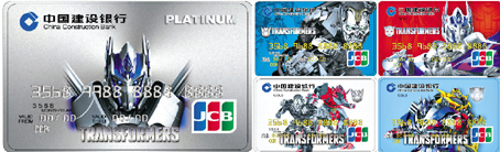 2009年《变形金刚2》电影上映,建行首度推出了动漫题材的以电影形象为卡面的四款变形金刚信用卡。与2009年双标识普卡不同的是,2014年新款变形金刚主题信用卡是一款JCB单标识卡产品,共发行五款。建行信用卡中心产品经理林海平向记者介绍,本卡主要定位于变形金刚影迷、动漫迷,他们年轻时尚,有集卡需求和网购、海淘的偏好,所以本卡在境外支付和网上跨境支付方面非常便捷。