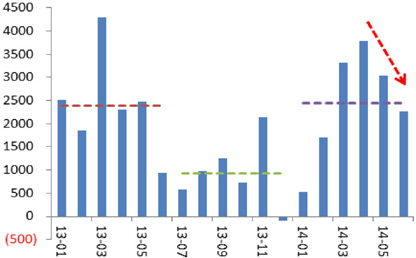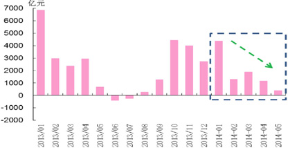 图6 2013年至2014年上半年中国月度外汇占款情况
