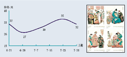 新邮走势一波三折,各品种间的强弱也非常分明,总体而言以5月中旬为分界线,此前新邮几乎表现低迷,但5月下旬开始新邮出现了回稳乃至走强的趋势,如4月中旬发行的“网络生活”小版张,面世价格为11元,仅比10.2元面值高出些许,且其后就不断下跌,5月中旬创出7.5元低位后反弹,7月底在10元附近交易,而“和平颂”套票上扬到3.8元左右,“浴马图”小型张和套票分别反弹至11.5元和5.5元,这些品种的价格已比6月初上扬了不止1成。