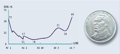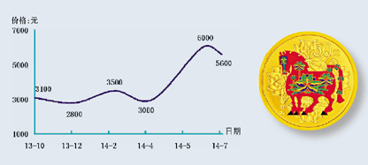 从金银币板块看,热点寥若晨星,上半年表现较强的只有“甲午马”彩金银套币,其价格从年初的3000元攀升到7月末的5600元,是升幅最大的新品,而“中法建交”金银套币虽然在发行后也出现了70%的升幅,但这完全是专家为了出货而拉高,在短期拉升后即大量抛售货源,价格因此呈现大起大落,该套金银套币从面世的8500元下滑到6800元,再被快速拉升至9800元,而到了7月末重新回落到6900元。