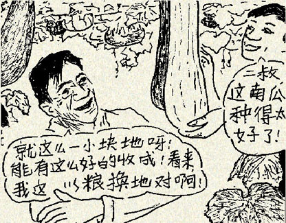 随着王二的地越来越多,余粮也多了。地少了,卖地的村民也相应提高了地块的价格。最后王二买一块地的粮食相当于一百年的收成了。