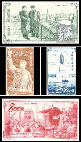 1953年10月5日名称改正为《伟大的十月革命三十五周年纪念》的正票发行,更正名称后的邮票发行量500万套,4枚邮票面值均为800元(旧币值,相对于新币值0.08元)。与“未发行”的错体票对比,正票除了票名删除了“苏联”两字外,其图案、面值一样,不过4枚邮票的刷色却发生变化,即第一枚和第三枚的绿与蓝互调,第二枚与第四枚的红与棕互换。
