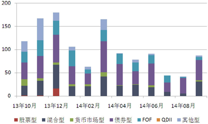 本月,18家证券公司或其资管公司共发行了87款集合理财产品,环比增加45款,增幅107.14%,平均首发目标规模11.25亿元,环比上升1.15亿元,增幅11.42%;债券型产品发行了43款,环比增加9款,增幅26.47%,平均首发目标规模9.71亿元,环比上升0.17亿元,增幅1.77%;混合型产品发行了31款,环比增加26款,增幅520.00%,平均首发目标规模10.77亿元,环比减少9.56亿元,降幅47.03%;FOF产品发行了7款,环比增加5款,增幅250.00%,平均首发目标规模1.08亿元,环比上升0.16亿元,增幅16.97%;货币市场型产品发行了3款,平均首发目标规模50.00亿元;其他型产品发行了3款。(图9)