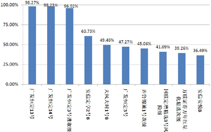 受季末时点影响,本月集合信托市场预期收益率普遍上升:1-2(含)年期限段产品平均预期收益率9.95%,环比上升91.68BP,其中,房地产领域平均预期收益率10.33%,环比上升89.16BP,工商企业领域平均预期收益率10.00%,环比上升111.87BP,基础设施领域平均预期收益率9.99%,环比上升80.05BP;2-3(含)年期限段产品平均预期收益率9.95%,环比上升109.00BP,其中,基础设施领域平均预期收益率9.78%,环比上升88.33BP;3年以上期限段产品平均预期收益率10.50%,环比上升305.00BP,其中,基础设施领域平均预期收益率10.50%,环比上升200.00BP。(图6)