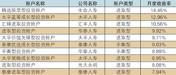 本月共有183个获得正收益率,其中包括保守型32个、稳健型57个、平衡型42个、进取型52个。以上四类投资账户的月度平均收益率依次为0.43%、1.78%、3.81%和4.91%。月度收益表现最好的10个投资账户中,进取型8个,平衡型2个,排名首位的是生命人寿的精选股票型投资账户。(表2)