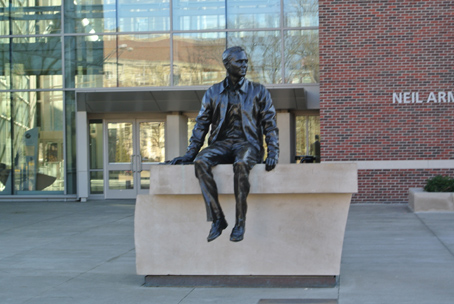 美国大学是社会的一个缩影,他们的校园设施紧紧围绕师生学习研究和生活匹配而建,校园内有小超市、餐厅、银行、书店,可以用学生卡消费,货品要比大超市贵很多,加上校园占地大,各学系教学楼相隔较远,停车场根据教育楼位置分为A\B\C三类,学生车辆停车场离教学楼都远,可以说学生校内交通工具以校园班车和自行车最为方便。每个教学楼和宿舍楼都备有一个足够学生使用的计算机房,即使没有电脑你也一样可以完成学习任务,所有打印不收费但会有记录。还有美国大学校园内会有很多雕塑,其都与学校的捐赠者和卓越者有关,下图雕像为登月者阿姆斯特朗,醒然摆放在普渡大学航天学院大楼门前。