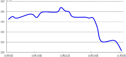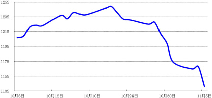 上周,因美元走强,且美国经济数据优于预期,带动国际金价大幅下跌,11月5日,国际金价收盘于1141.10美元/盎司,较前一周下跌2.80%。