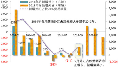 金融:9月外汇占款余额由上月的减少311亿元,重新转为正增长,但增幅较小,仅为11亿元。据此推算,跨境资金净流出规模约2448亿元。自5月来,外汇占款增量呈明显双向波动态势,且跨境资金净流出规模始终保持在2000亿元上方。上月美联储正式宣布结束QE政策,如资金趋势性回流美国,将对我国外占增长和流动性带来冲击。但考虑美国经济尚处温和复苏,加息料不会早于明年年中,且QE退出经历了渐进过程,市场已充分适应,剧烈波动重现应不大可能。因此,本次美元趋势性走强的影响,在国际流动性宽裕的环境下,或更多反映在大宗商品价格疲软和对国内的通缩输入方面,而资金流动上的冲击则还要取决于中国自身基本面,若国内经济能够保持平稳增长,相信国际资本流动对中国外占增长的作用将较为有限。(图1)