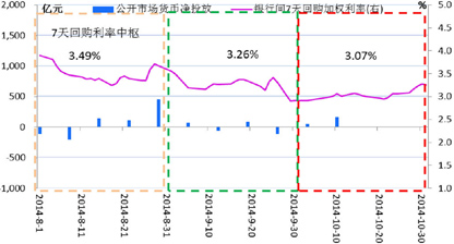 10月份资金面整体较9月份宽松,7天回购利率月度中枢为3.07%,较9月下降19bps。10月上旬,受月中缴税因素影响,7天回购利率缓慢震荡上升。10月14日,央行再次下调14天正回购利率10bps至3.4%,且市场传闻央行对股份制银行进行规模约3000亿MLF(中期借贷便利)操作,令市场宽松预期急剧升温,7天回购利率一路走低,在21日触及月度低点2.95%。月末,由于新股申购较为密集,资金面趋紧,7天回购利率小幅震荡走升。(图2)