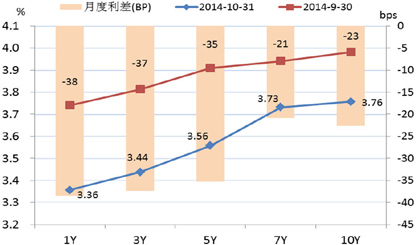 10月份利率债共发行约3837亿元,净供给量约为2198亿元,较9月份分别下降约117亿元和199亿元。二级市场方面,受央行再次调降14天正回购利率以及推出针对股份行约3000亿MLF操作影响,国债收益率曲线陡峭化下行。截至10月31日,国债1年和3年期较9月末分别下降了38和37bps,长端收益率下行幅度较小,7-10年期国债收益率较9月末下降21-23bps。(图3)
