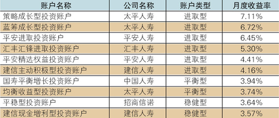 本月共有181个获得正收益率,其中包括保守型32个、稳健型56个、平衡型41个、进取型52个。以上四类投资账户的月度平均收益率依次为0.61%、1.75%、1.66%和1.88%。月度收益表现最好的10个投资账户中,进取型6个,平衡型2个,稳健型2个,排名首位的是太平人寿的策略成长型投资账户。(表2)