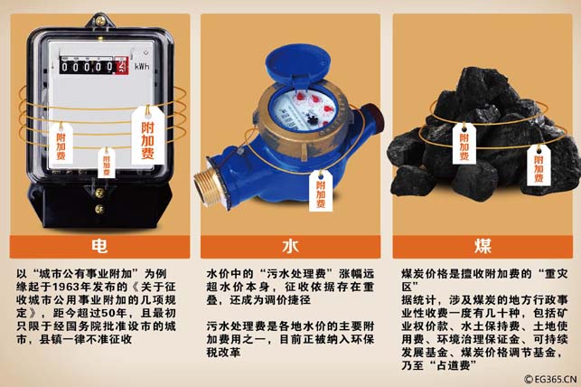 在很多人的心目中,一吨水、一度电、一升汽油的价格都有清晰、统一的标准。事实上,在一张张居民水、电、汽油的缴费单里,均含有多项“附加”的费用:每一吨生活用水的价格里,有公共事业费、排污费等附加费;每度城乡居民电价里,至少包括5种附加费,各地规定普遍占电价的5%左右;而在海南等一些地方,一升汽油的售价里,还有1块多钱的“车辆通行附加费”。财政部相关负责人表示,我国将清理规范民生资源附加费在内的行政事业性收费和政府性基金,对于未列入财政部目录清单的行政事业性收费和政府性基金,公民、法人和其他组织有权拒绝缴纳。图/CFP