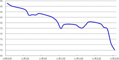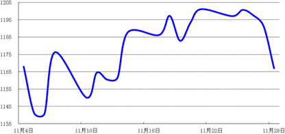 上周,因石油输出国组织拒绝降低石油产量,引发国际油价暴跌,并进一步带动大宗商品价格全面走低,有关全球经济成长的忧虑也令贵金属价格承压。布伦特原油当周累计下跌12.71%,周五收于70.02美元/桶;国际金价下跌2.84%,周五收于1167.04美元/盎司。