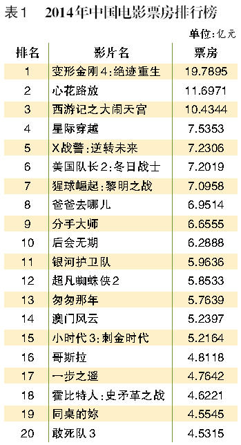 今年票房排名前20的影片中,国产片与进口片在数量上,平分秋色,但各自的票房总和,进口片要高出7亿。这其中主要的票房来自于《变形金刚4》。而国产影片中,《心花路放》和《西游记之大闹天宫》的表现优异,而被寄予厚望的《一步之遥》却在上映之后收获两极口碑,最终票房估计难过《让子弹飞》的水准线。也正是因为《一步之遥》的疲软表现,让年度票房距离300亿整数大关,也有了这让人扼腕的一步之遥。具体票房排行见表1。