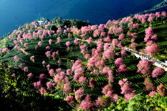 2014年12月7日,24节气大雪节令,云南大理州南涧县无量山镇蛇腰箐华庆茶厂的千亩茶园里,上千株冬樱树樱花在绽放。■ 张良/ 图文