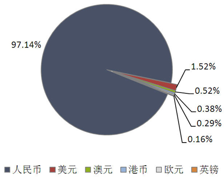 从投资币种来看,人民币产品发行5430款,环比增加1084款,市场占比上升0.06个百分点至97.14%;美元产品发行85款,环比增加16款,市场占比下降0.02个百分点至1.52%;澳元产品发行29款,环比增加7款,市场占比上升0.03个百分点至0.52%;港币产品发行21款,环比增加4款,市场占比仍然为0.38%;欧元产品发行16款,环比增加1款,市场占比下降0.05个百分点至0.29%;英镑产品发行9款,环比增加1款,市场占比下降0.02个百分点至0.16%。(图2)