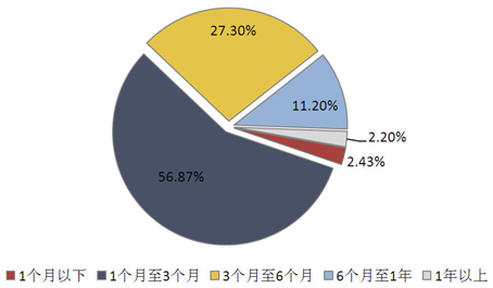 从投资期限来看,1个月以下产品发行136款,环比增加21款,市场占比下降0.14个百分点至2.43%;1-3个月产品发行3179款,环比增加970款,市场占比上升7.53个百分点至56.87%;3-6个月产品发行1526款,环比增加48款,市场占比下降5.71个百分点至27.30%;6-12个月产品发行626款,环比增加40款,市场占比下降1.89个百分点至11.20%;1年以上产品发行123款,环比增加34款,市场占比上升0.21个百分点至2.20%。(图3)
