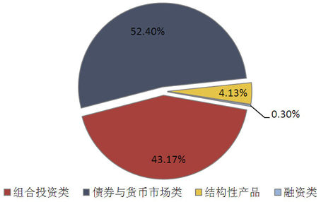从投向类型来看,债券与货币市场类产品发行2929款,环比增加752款,市场占比上升3.77个百分点至52.40%;组合投资类产品发行2413款,环比增加340款,市场占比下降3.14个百分点至43.17%;融资类产品发行17款,环比增加4款,市场占比上升0.01个百分点至0.30%;结构性产品发行231款,环比增加17款,市场占比下降0.65个百分点至4.13%。(图4)