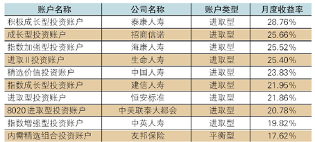 本月共有167个获得正收益率,其中包括保守型30个、稳健型52个、平衡型38个、进取型47个。以上四类投资账户的月度平均收益率依次为0.58%、3.99%、5.63%和7.13%。月度收益表现最好的10个投资账户中,进取型9个,平衡型1个,排名首位的是泰康人寿的积极成长型投资账户。(表2)