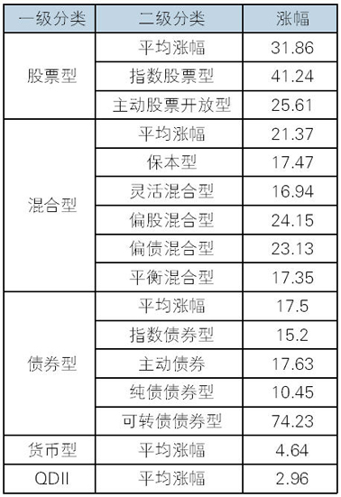 在偏股基金中,指数型基金平均涨幅达到了41%位居各类基金首位,其中国投瑞银沪深300 ETF、国泰上证180金融ETF分别以89.11%、 89.04%的涨幅位居前二。