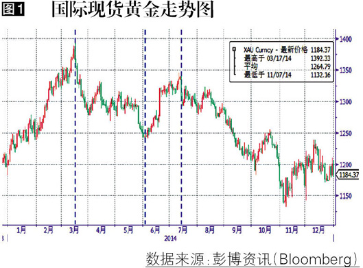 2014年国际黄金现货市场开于1201.85美元/盎司,收于1184.37美元/盎司,跌1.45%。期间最高价1392.33美元/盎司,最低价1132.16美元/盎司,区间宽度260美元(图1)。国内黄金市场与国际走势趋同,上海金交所黄金(9999)开于239元/克,收于240元/克,最高价273.30元/克,最低价222.60元/克,全年几乎收平。