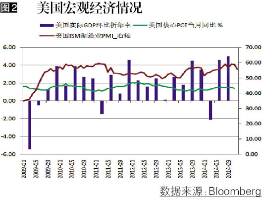 2014年美国经济延续全面复苏态势。二、三季度实际GDP表现强劲,环比折年率分别增长4.6%、5%,其中三季度GDP创下十一年最快增速。制造业稳中有升,下半年ISM制造业PMI均值57.65,全年均值55.81,远高于2013年的均值53.89。物价方面,全年核心PCE位于1.5%以下,且受低油价影响,未来通胀抬头可能性较小。劳工市场复苏步伐加快,全年月均新增非农就业21.9万人,远高于2013年全年的16.5万人,失业率位于6.0%以下。