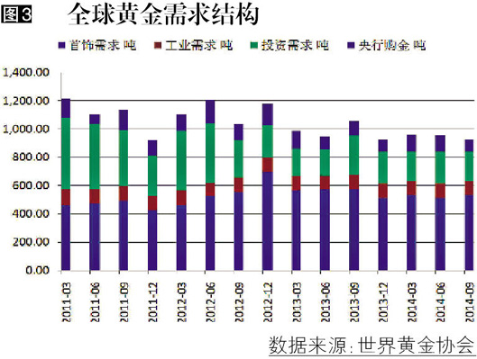 2014年中印黄金实需对金价提供的支撑不及预期。受2013年高基数影响,2014年中国黄金实需有所回落。前三季度,中国黄金消费量为638吨,较去年同期的1,010吨大幅萎缩36.8%。预计全年中国黄金需求900吨左右。三季度印度黄金消费较去年同期增长39%,达到225吨,2014年全年印度黄金实需有望达950吨。