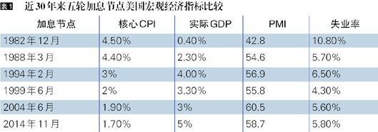 我们维持美联储将于2015年中首次加息的中性预测。理由有三:一是从收入、消费等数据来看,美国经济发展内生动能强劲。二是对比当前与历史上加息时点的美国宏观经济表现(表1),实际GDP、PMI、失业率等指标显示加息条件较为成熟。且12月FOMC会议纪要显示,委员们认为只要美国经济持续改善,低通胀不足以阻挡美联储加息步伐。三是耶伦执掌美联储后实施的货币政策按步就班,基本符合市场预期,预计在加息时点选择上也将延续此风格。